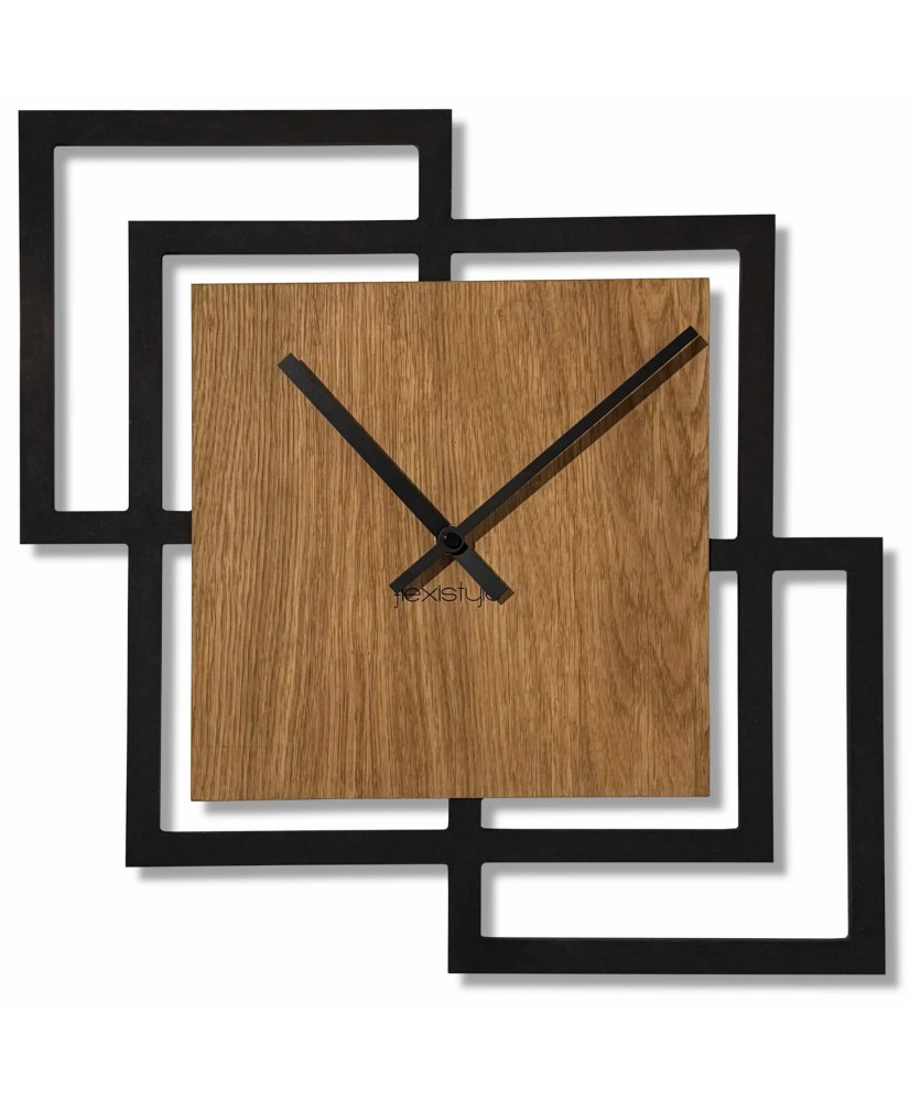 Triplikas – tai išskirtinio dizaino sieninis laikrodis, sudarytas iš trijų tarpusavyje persidengiančių kvadratų. Juodas ažūrinis rėmas ir natūralaus ąžuolo plokštumos kuria dinamišką, bet vizualiai subalansuotą kompoziciją, kuri tampa ryškiu interjero akcentu.
