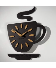 Medinis sieninis virtuvinis laikrodis. Puodelio su užrašu „kava“ motyvas. Sieninio laikrodžio ciferblatas iš ąžuolo faneros. Rekomenduojamas virtuvėje, bet puikiai tiks ir kavinėje, valgomajame ir pan.