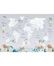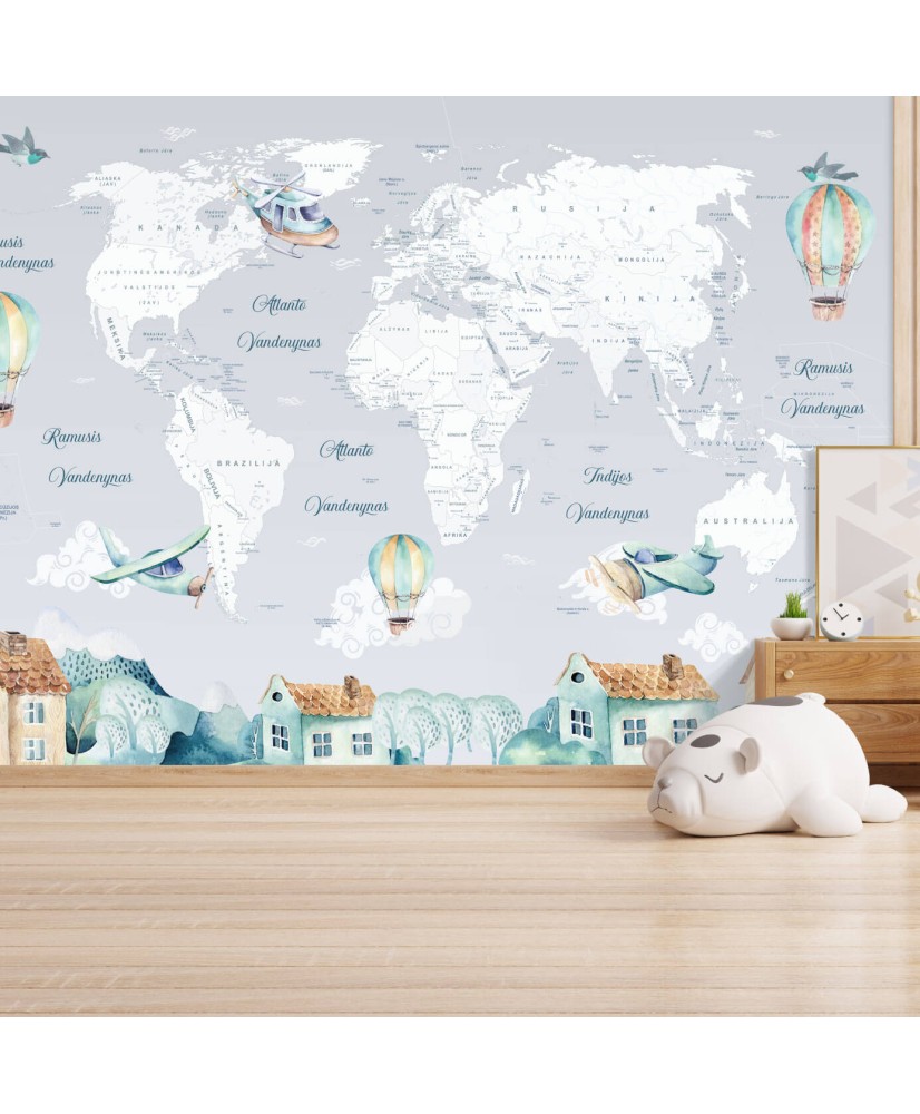 Pastelinių spalvų fototapetai vaikų kambariui su pasaulio žemėlapiu, oro balionais ir lėktuvais. Edukacinis ir dekoratyvus akcentas mažiesiems tyrinėtojams.