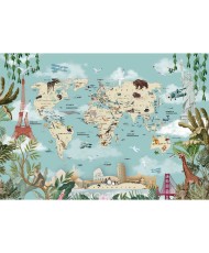 Žaismingi fototapetai su pasaulio žemėlapiu lietuvių kalba, apsuptu linksmų gyvūnų. Šis dizainas kviečia vaikus leistis į nuotykius, pažinti žemynus ir atrasti pasaulio paslaptis. Puikus pasirinkimas jaukiam ir įkvepiančiam vaikų kambariui.
