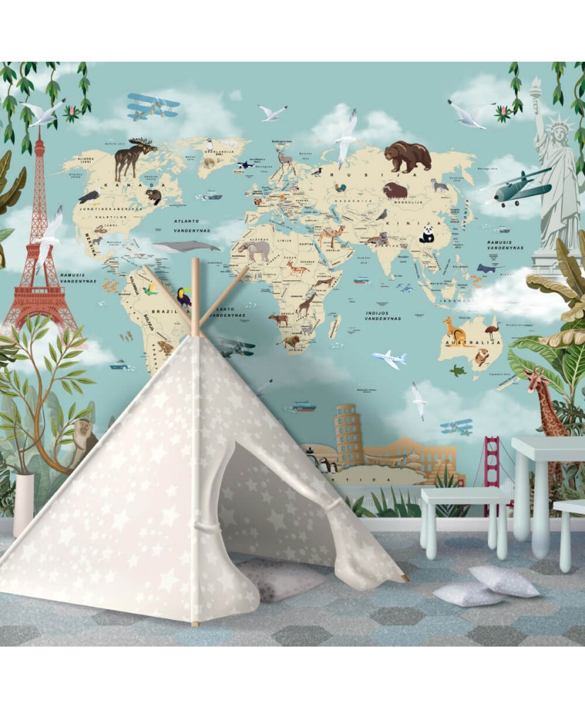 Žaismingi fototapetai su lietuvišku pasaulio žemėlapiu, kupinu gyvūnų, miestų ir kelionių simbolių. Įkvepia vaikus tyrinėti, svajoti ir atrasti pasaulį kasdien.